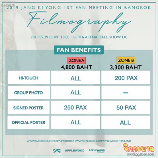 แต่ที่แน่ๆ แฟนๆเตรียมตัวกันให้พร้อม เพราะหนุ่มสุดหล่อคนนี้ ตั้งอกตั้งใจซ้อม เพื่อแฟนมีตติ้งครั้งนี้อย่างมาก ทั้งร้อง ทั้งเต้น จัดเต็มทุกกิจกรรม แถมยังคิดเกมส์เตรียมที่จะมาเล่นกับแฟนคลับในไทยด้วยตัวเอง งานนี้รับรองความฟิน นั่งไม่ติดเก้าอี้แน่นอน การันตีความฟินโดยผู้จัดใจดีอย่าง บริษัท แอ๊ปเปิ้ลวูด (เกาหลี)(APPLEWOOD CREATIVE) และ บริษัท แอ๊ปเปิ้ลวูด (ไทยแลนด์) (APPLEWOOD THAILAND) พร้อมดีเดย์เปิดจำหน่ายบัตรงานแฟนมีตติ้ง “Jang Ki Yong 1st Fan meeting in Bangkok” [Filmography] ทั่วประเทศในวันเสาร์ที่ 17 สิงหาคม 2562 ตั้งแต่เวลา 10:00 น. เป็นต้นไป ทาง www.applewoodth.com บัตรราคา 4,800 / 3,300 บาท ติดตาม และสอบถามรายละเอียดเพิ่มเติมได้ที่ Official Facebook Pages: www.facebook.com/applewoodkr และ www.facebook.com/applewoodthailand