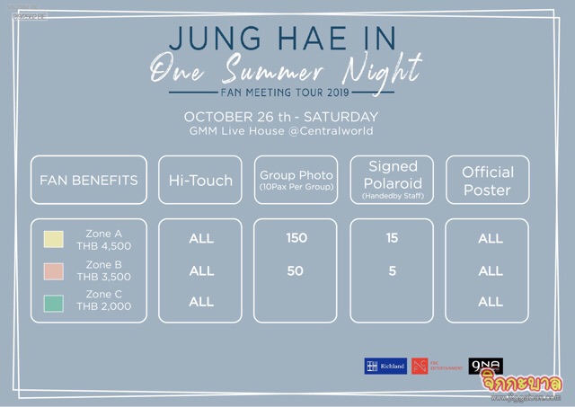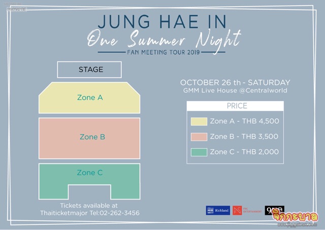 นาทีนี้ตำแหน่งสามีแห่งชาติจะเป็นใครไปไม่ได้ นอกจากหนุ่มน้อยหน้าใส เจ้าของรอยยิ้มกระชากใจ พลังทำลายล้างหัวใจสูง “Jung Hae In” (จองแฮอิน) นักแสดงหนุ่มดาวรุ่งพุ่งแรงแซงรุ่นพี่ มาพร้อมรอยยิ้มทรงเสน่ห์ครองใจสาวๆ ทั่วเอเชีย ประกาศเดินสายทัวร์เพื่อพบปะแฟนๆ อีกครั้ง และแน่นอนว่าโปรโมเตอร์มากฝีมืออย่าง “9NA” ไม่พลาดที่จะคว้าตัวมาประเทศไทย กับงานแฟนมีตติ้งภายใต้ชื่องาน … “JUNG HAE IN ‘One Summer Night’ Fan Meeting Tour 2019” (จองแฮอิน วัน ซัมเมอร์ ไนท์ แฟนมีตติ้ง ทัวร์ 2019) จะมีขึ้นในวันเสาร์ที่ 26 ตุลาคม 2562 ณ จีเอ็มเอ็ม ไลฟ์ เฮ้าส์, เซ็นทรัลเวิลด์ บัตรราคา 4,500 / 3,500 / 2,000 บาท (บัตรนั่งทั้งหมด) จำหน่ายบัตรผ่านทาง ไทยทิคเก็ตเมเจอร์ ทุกสาขา หรือ www.thaiticketmajor.com โทร 0-2262-3838