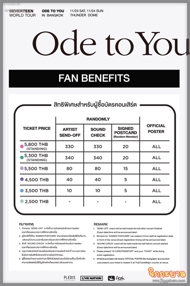 ​ออดอ้อนบอกรัก บอกคิดถึงกันผ่านคลิป อดใจรอเจอกะรัตไทยไม่ไหวแล้ว เจอแบบนี้เข้าไป ไม่พร้อม ก็ต้องพร้อมแล้วล่ะแม่!! ชาวกะรัตไทยอย่าไป Fear ใส่ Gear เดินหน้าให้เต็มกำลัง ส่งพลังความคิดถึงกลับไปหาพวกเขาด้วยการร่วมกดจองบัตรคอนเสิร์ต ‘SEVENTEEN WORLD TOUR IN BANGKOK’ ให้พร้อมเพรียง เตรียมพร้อมลงสนามประลองความไวในวันเสาร์ที่ 19 ตุลาคม 2562 นี้ เลือกวันให้ตรงใจ พร้อมล็อคโซนที่นั่งกันให้แม่น แล้วจิ้มกันได้เลย บัตรราคา 5800 (Standing) / 5300 (Standing) / 5500 (Seating) / 4500 (Seating) / 3500 (Seating) / 2500 (Seating) เปิดจำหน่ายทางเคาน์เตอร์ไทยทิคเก็ตเมเจอร์ ทุกสาขา หรือ www.thaiticketmajor.com ติดตามรายละเอียดเพิ่มเติม และความพิเศษอื่นๆ ได้ทาง https://www.facebook.com/FeohThai และ Twitter @FeohThai แล้วเตรียมมาฟิน มาอินไปพร้อมกับความสนุก รอยยิ้ม ในคอนเสิร์ตครั้งนี้ งานนี้รับรองความพิเศษจากทั้ง 13 หนุ่ม “SEVENTEEN”