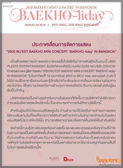 เนื่องด้วยเหตุการณ์การแพร่ระบาดของเชื้อไวรัสโคโรน่าสายพันธุ์ใหม่ในขณะนี้ บริษัท PLEDIS ENTERTAINMENT ต้นสังกัดของศิลปิน แบคโฮ นิวอีส และบริษัท DSHOW Entertainment ผู้จัดการแสดง “2020 NU’EST BAEKHO MINI CONCERT ‘BAEKHO-liday’ IN BANGKOK” ในวันอาทิตย์ที่ 16 กุมภาพันธ์ 2563 ณ MCC Hall, เดอะมอลล์ บางกะปิ ได้มีการปรึกษาหารือร่วมกันและรู้สึกเสียใจที่จะต้องประกาศเลื่อนการจัดงานดังกล่าวออกไปก่อน เพื่อความปลอดภัยทางด้านสุขภาพของศิลปิน ทีมงาน และแฟนคลับผู้ชมอันเป็นสำคัญ