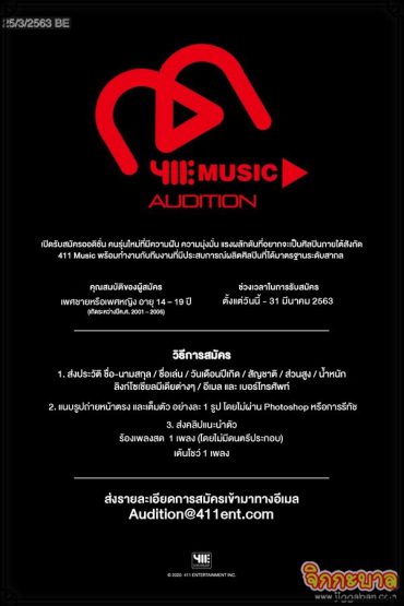 ล่าสุดค่ายเพลงของ บิ๊กบอสกึ้ง เลยตอกย้ำเจตนารมณ์ด้วยการเดินหน้าสนับสนุนเด็กไทยกันอีกขั้น กับโครงการ “411 MUSIC AUDITION” เปิดรับสมัครเยาวชนคนรุ่นใหม่ทั้งชายและหญิงอายุ 14–19 ปี (เกิดระหว่างปีค.ศ. 2001–2006) ผู้มีความฝัน ความมุ่งมั่น และแรงผลักดันเต็มเปี่ยม เข้าร่วมออดิชั่นเพื่อเป็นศิลปินในสังกัด “โฟร์ วัน วัน มิวสิก” พร้อมรับโอกาสร่วมงานกับทีมงานซึ่งมีประสบการณ์ผลิตศิลปินที่ได้มาตรฐานระดับสากล ** ใครรู้ตัวว่าใช่ และชอบทางนี้ สามารถส่งรายละเอียดการสมัครกันได้ทางอีเมล Audition@411ent.com ตั้งแต่วันนี้ จนถึงวันที่ 31 มีนาคม 2563 ** ติดตามกติกาและวิธีการสมัคร “411 MUSIC AUDITION” โดยละเอียดได้ที่ออฟฟิเชียลแฟนเพจ www.facebook.com/fouroneoneent ทวิตเตอร์ @411ent และอินสตาแกรม IG @411ent https://instagram.com/411ent รวมทั้งอินสตาแกรมของซีอีโอกึ้ง IG @kueng_chalermchai http://instagram.com/kueng_chalermchai