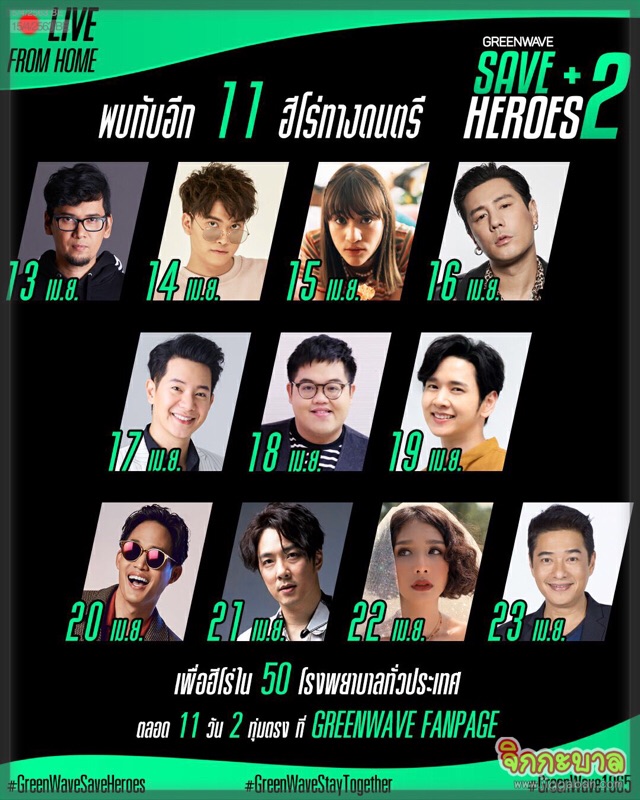 ขอบคุณทุกน้ำใจที่ทำให้ Greenwave Save Heroes 99 บาท ก้าวผ่านโควิด-19 ของคลื่น กรีนเวฟ 106.5 เอฟเอ็ม ที่ชวน 9 ศิลปิน มา Live สดร้องเพลงชวนทุกคนร่วมบริจาคคนละ 99 บาท เพื่อซื้อชุด PPE มอบให้ทีมแพทย์ พยาบาล และบุคลากรทางการแพทย์ 50 โรงพยาบาล ได้สำเร็จลุล่วงไปได้ด้วยดี เตรียมพร้อมจัดส่งของให้แก่ 50 โรงพยาบาลแรกแล้ว โดยงานนี้ทั้ง 9 ศิลปินอย่าง แสตมป์ อภิวัชร์ / แก้ม วิชญาณี / ชาติ สุชาติ / มาเรียม เกรย์ / ว่าน ธนกฤต / สิงโต นำโชค / แว่นใหญ่ / กัน นภัทร และโรส ศิรินทิพย์ ต่างก็ช่วยกันอย่างเต็มที่ บางคนทั้งร้องทั้งเต้น บางคนแต่งเพลงขึ้นใหม่ เพื่อให้กำลังใจหมอ พยาบาล และบุคลากรทางการแพทย์โดยเฉพาะทุกคนต่างดีใจที่ได้เป็นส่วนหนึ่งของกิจกรรมดีๆ ที่นอกจากให้ทุกคนได้ฟังเพลงเพราะๆคลายเหงาผ่านทางออนไลน์ในช่วงที่ต้องหยุดอยู่บ้านเพื่อชาติกันแล้ว ยังได้ส่งต่อกำลังใจให้กับคุณหมอและพยาบาลเหล่าฮีโร่ของพวกเราผ่านโซเชียลด้วยกันอีกด้วย