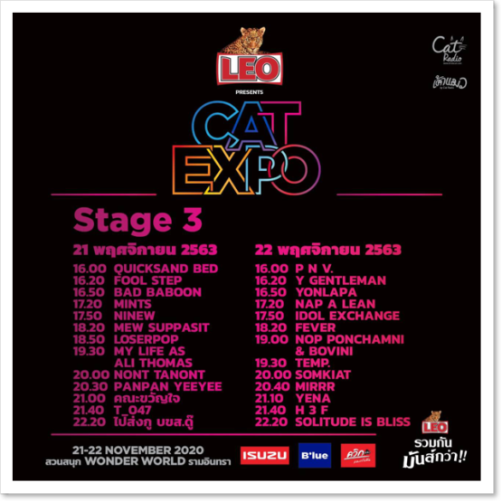 ใกล้เข้ามาแล้วกับงานเทศกาลดนตรีที่จะชวนแฟนเพลงของศิลปินทุกค่ายทุกแนวมาร่วมชาร์จพลังกับ LEO PRESENTS CAT EXPO 7 จัดโดย CAT RADIO ( แคท เรดิโอ) อีกหนึ่งงานสนุกประจำปีที่เคยสร้างความประทับใจความทรงจำเต็มเปี่ยมไปด้วยความสุขสนุกครบรสให้แฟนเพลงที่มาร่วมชมคอนเสิร์ตและอุดหนุนศิลปินในบรรยากาศแบบผู้ผลิตพบผู้บริโภค ปีนี้ปักหมุดนัดกันที่สวนสนุก Wonder World รามอินทรา เพิ่มเติมความบันเทิง ความหลากหลาย ที่รวมพลคนดนตรีมากกว่า 100 ชีวิต ทั้งศิลปินที่มีบทเพลงฮิต เป็นที่ชื่นชอบของแฟนเพลงทั่วประเทศ และศิลปินที่มีแนวเพลงดนตรีที่โดดเด่นไม่ซ้ำใคร มีเอกลักษณ์บนถนนสายดนตรี พร้อมขนเพลงหลากหลายสไตล์ ท่ามกลางบรรยากาศน่าตื่นตาตื่นใจ ใน 5 เวที กับ 2 วันเต็ม เผยรายชื่อศิลปินสแตนด์บายพร้อมโชว์จัดเต็ม