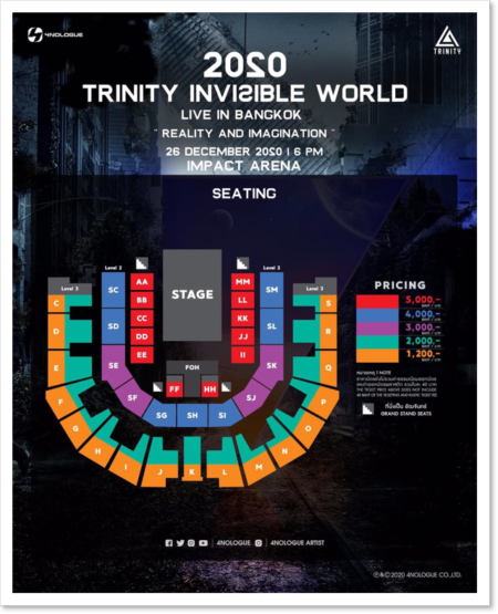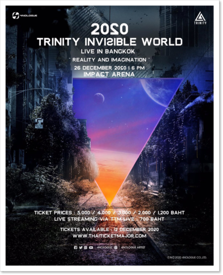 แฟนๆ เตรียมกดบัตรแล้วมาเจอกันใน “2020 TRINITY INVISIBLE WORLD LIVE IN BANGKOK : REALITY AND IMAGINATION” วันที่ 26 ธ.ค. นี้ ณ อิมแพ็ค อารีน่า เมืองทองธานี บัตรราคา 5,000 / 4,000 / 3,000 / 2,000 และ 1,200 บาท หรือรับชมผ่านทาง Live Streaming by TTM LIVE บัตรราคา 700 บาท สามารถซื้อบัตรได้ที่ Thaiticketmajor ตั้งแต่วันที่ 12 ธ.ค. นี้ เป็นต้นไป และติดตามรายละเอียดเพิ่มเติมได้ที่โซเชี่ยลมีเดี่ยของ 4NOLOGUE ทุกช่องทาง