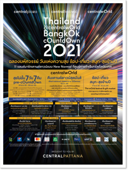 กรุงเทพฯ – บริษัท เซ็นทรัลพัฒนา จำกัด (มหาชน) ผู้บริหารศูนย์การค้าเซ็นทรัลเวิลด์ เซ็นทรัลพลาซา เซ็นทรัลเฟสติวัล เซ็นทรัล ภูเก็ต และเซ็นทรัลวิลเลจ จับมือพันธมิตรธุรกิจ ได้แก่ การท่องเที่ยวแห่งประเทศไทย, บริษัท แอดวานซ์ อินโฟร์ เซอร์วิส จำกัด (มหาชน), บริษัท ซันโทรี่ เป๊ปซี่โค เบเวอเรจ (ประเทศไทย) จำกัด, มาสเตอร์การ์ด, บริษัท สิงห์ คอร์เปอเรชั่น จำกัด, บริษัท โตโยต้า มอเตอร์ ประเทศไทย จำกัด, บริษัท ช้างอินเตอร์เนชั่นแนล จำกัด, บริษัท แพลน บี มีเดีย จํากัด (มหาชน), บริษัท ไลน์ คอมพานี (ประเทศไทย) จำกัด และบริษัท วันสามสิบเอ็ด จำกัด (ช่อง ONE 31) จัดงาน “Thailand & centralwOrld bangkOk cOuntdOwn 2021” ตอกย้ำความเป็น Global & Thailand’s Best Entertainment Countdown Destination อย่างยิ่งใหญ่ตลอดกาลในคืนส่งท้ายปีเก่า ชวนเคาท์ดาวน์รูปแบบ New Normal ไปพร้อมกัน ณ ศูนย์การค้าเซ็นทรัล 11 สาขาทั่วประเทศ พร้อมเข้มงวดมาตรการ ‘เซ็นทรัล สะอาด มั่นใจ’ ในทุกศูนย์ฯ ตามมาตรการของ ศบค. ตื่นตาตื่นใจกับครั้งแรกของการเคาท์ดาวน์แบบ Interactive Digital Experience ที่เซ็นทรัลเวิลด์ ผ่านจอ the panOramix และดิจิทัลสกรีนทั้งในและนอกศูนย์รวมพื้นที่กว่า 5,000 ตร.ม. อลังการพลุต่อเนื่องยาว 5 นาที กว่า 6,000 นัด และครั้งแรกกับ AIS 5G Interactive Wall ส่งภาพอวยพรปีใหม่ของคุณสู่จอ the panOramix ใจกลางเมืองรับปี 2021 ยิ่งใหญ่สมกับที่เป็น ‘Times Square of Asia’ โดยคืนวันที่ 31 ธ.ค. 63 สามารถรับชมถ่ายทอดสดผ่านแอปพลิเคชัน LINE TV เริ่ม 18:00-00:15 น., ช่อง ONE 31 เริ่ม 22:15-00:15 น., ช่อง 3 เริ่ม 23.45 น. – 00.05 น.