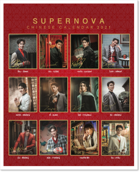 ในปี 2564 นี้ เราได้จัดทำปฏิทินจีนเฉพาะแบบตั้งโต๊ะ ด้วยเทคนิคการพิมพ์ และกระดาษแข็งแรงสวยงาม เพื่อเป็นการส่งความสุข มอบรอยยิ้ม ให้แฟนๆ ได้ฟินกันตลอดทั้งปีที่เปิดปฏิทิน เราได้นำดารานักแสดง 12 หนุ่มดาวรุ่งสุดฮอตจากช่อง 3 ได้แก่ ภณ ณวัสน์, ไอซ์ ภาณุวัฒน์, อิน สาริน, ออกัส วชิรวิชญ์, จ๊อบ ธัชพล, กระทิง ขุนณรงค์, มีน พีรวิชญ์, ไบรท์ รพีพงศ์, ตี๋ ธนพล, ริว วชิรวิชญ์, กองทัพ พีค และ สมิธ ภาสวิชญ์ มาสวมมาดอาตี๋สุดหล่อเป็นแบบในการถ่ายปฏิทินจีน ปี 2564 ชุด “SUPERNOVA CHINESE CALENDAR 2021” ในครั้งนี้ ผ่านชุดเสื้อผ้าคอลเลคชั่นที่ออกแบบมาโดยเฉพาะสำหรับปฏิทินจีนปีนี้ จาก 27 Friday By คุณชนะชัย จรียะธนา และถ่ายทอดภาพออกมาได้อย่างสวยงามโดยฝีมือการถ่ายภาพของช่างภาพระดับแนวหน้าของเมืองไทย คุณ Vin Buddy ในบรรยากาศอาคารจีนร่วมสมัยที่ดราก้อนทาวน์ สามย่าน