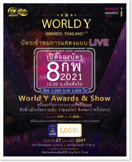 ใกล้เข้ามาเต็มทีแล้ว สำหรับงาน WORLD Y AWARDS (THAILAND) การประกวดซีรีส์วาย หรือ Boy Love ในประเทศไทย เพื่อคัดเลือกผู้ชนะเลิศให้เป็นตัวแทนไปประกวดวายระดับโลกในงาน WORLD Y AWARDS 2020 ที่ มาเก๊า ประเทศจีน โดย บริษัท ไทยเจียระไนกรุ๊ป ยักษ์ใหญ่วงการสื่อจีนในประเทศไทย เจ้าของนิตยสาร @ManGu (แอท ม่านกุ) ซึ่งเป็นนิตยสารภาษาจีนที่ทรงอิทธิพลที่สุด ทั้งในจีนและไทย ได้เตรียมการประกวด World Y Awards นี้ขึ้นตั้งแต่ปลายปี 2019 ซึ่งนับเป็นครั้งแรกของโลกที่มีเวทีประกวดรางวัลสำหรับซีรีส์วายครั้งแรกที่ประเทศไทย ล่าสุดเปิดโอกาสให้แฟนคลับได้ร่วมลุ้นจองบัตร VIP LIVE ที่มีเพียง 1,000 ผู้โชคดีที่จะได้ขึ้นจอให้กำลังใจ และชมโชว์พิเศษจากศิลปินชั้นแนวหน้ามากกว่า10 โชว์ พร้อมชมการเดินพรมแดงจากศิลปินวายทั่วฟ้าเมืองไทยมากกว่า30 เรื่อง ในวันที่ 27 กุมภาพันธ์ 2564 ตั้งแต่เวลา15.00-19.30 น. โดยจะเปิดให้จองบัตร วันที่ 8 กุมภาพันธ์ 2564 ราคาเดียว 1,000 บาท มีเพียง 1,000 ใบเท่านั้น ซื้อบัตรได้ที่ https://myfun.live/event/world-y-awards-thailand-1st/ สำหรับบัตรปกติราคา 500 บาทเปิดขายตั้งแต่วันที่ 9-25 กุมภาพันธ์ 2564 ไม่อยากพลาดความสนุก ติดตามรายละเอียดได้ที่ Myfun.live ส่วนใครที่ยังไม่ได้โหวตวายที่คุณชื่นชอบ สามารถส่งกันเข้ามาได้ทั้งสองช่องทางคือ SMS 4194333 และ ทางออนไลน์ที่ https://worldyawards.com ตั้งแต่วันนี้ ถึงวันที่18 กุมภาพันธ์ 2564