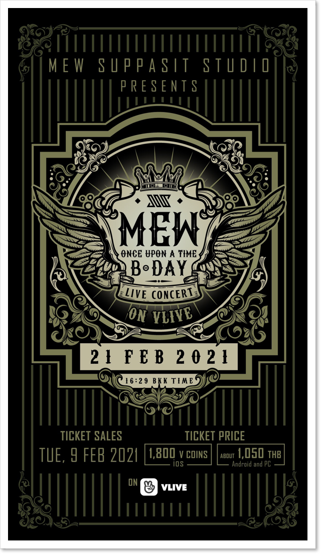 อยากร่วมฉลองวันเกิดไปกับ มิว ศุภศิษฏ์ สามารถกดซื้อบัตรเข้าชม “MEW Once Upon a Time B DAY LIVE CONCERT” ได้เลยตั้งแต่วันนี้ ผ่านทางแอพพลิเคชั่น VLIVE https://www.vlive.tv/product/ds00u00u00000372 ราคาเดียว 1,800 v Coins และไปร่วมสนุกไปพร้อมกันในวันที่ วันที่ 21 กุมภาพันธ์นี้ เวลา 16.29น.