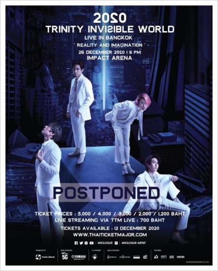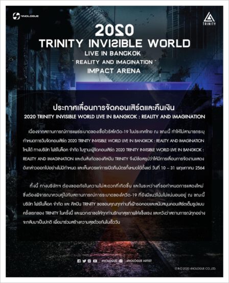 ประกาศเลื่อนการจัดคอนเสิร์ตและคืนเงิน 2020 TRINITY INVISIBLE WORLD LIVE IN BANGKOK : REALITY AND IMAGINATION
