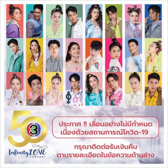 ‘โควิดส่งผลกระทบวงการบันเทิง’ ช่อง 3 ประกาศยกเลิกคอนเสิร์ต 50 ปี Infinity Love “Channel 3 Charity Concert Presented by Mitsubishi Motors” คืนเงินทุกกรณี