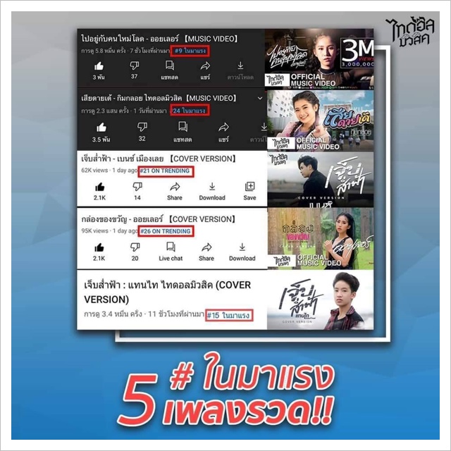 ขึ้นเทรนด์ไม่หยุด!!! “ไทดอลมิวสิค” ส่งเพลงไหนก็โดน #ในมาแรง 5 เพลงรวด