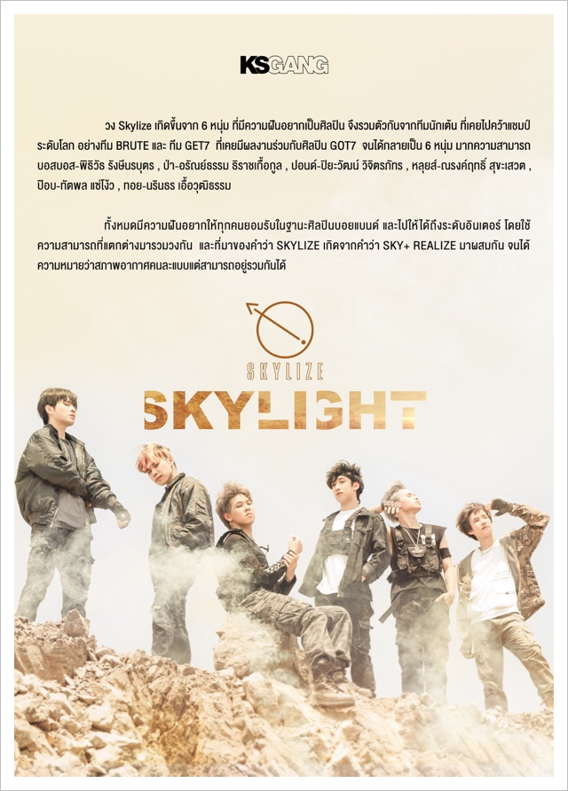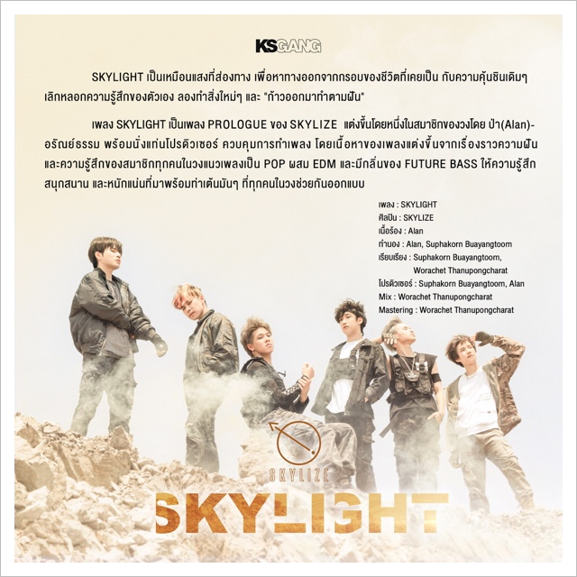 ทุกคนต้องมีความฝัน และต้องไปให้ถึงฝัน คือสิ่งที่ 6 หนุ่ม “SKYLIZE” ตั้งเป้าหมายมาตลอด บทพิสูจน์ความอดทน จนวันนี้ปล่อย Prolouge Single กับเพลง “Skylight” ค่าย KS GANG ซิงเกิลแรกที่บอกความเป็นตัวตนของพวกเขา กับคอนเซ็ปต์ “Unity” ความเป็นหนึ่งเดียวกัน ทั้ง 6 คน ได้สื่อความเป็นตัวตนออกมา ผ่านสภาพอากาศ โดย บอสบอส คือSunny (แสงแดด), ป่า(Alan) คือ Windy (สายลม), ป๊อป คือ Cloudy (ก้อนเมฆ), หลุยส์ คือRainy (ฝน), ปอนด์ คือ Snowy (หิมะ) และทอย คือ Foggy (หมอก) ที่ต่อให้มีสภาพแตกต่างกันมากๆ แต่ก็สามารถอยู่ด้วยกันได้ นอกจากนี้เอกลักษณ์ที่โดดเด่นของวง SKYLIZE ที่จะได้เห็น ก็คือการเต้นที่แข็งแรง มีพาวเวอร์ จนได้ฉายาว่า Combat Dances