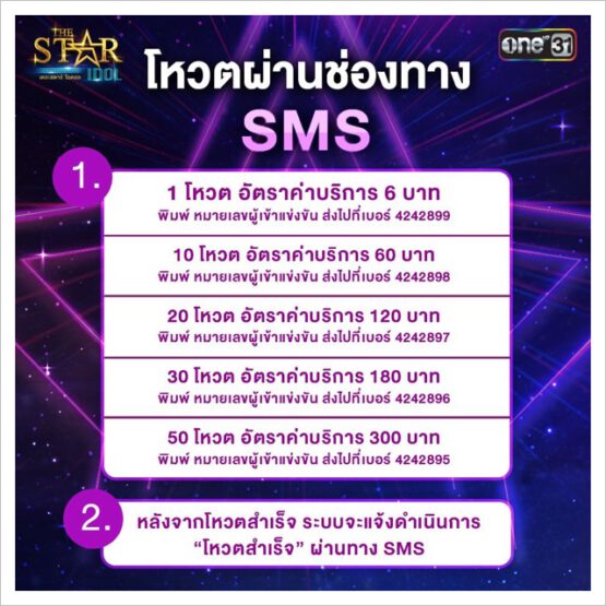 -SMS พิมพ์เลขผู้เข้าแข่งขัน ส่งไปที่เบอร์ 4242899 1 โหวต 6 บาท (ไม่รวมภาษีมูลค่าเพิ่ม และค่าธรรมเนียนอื่นๆ)