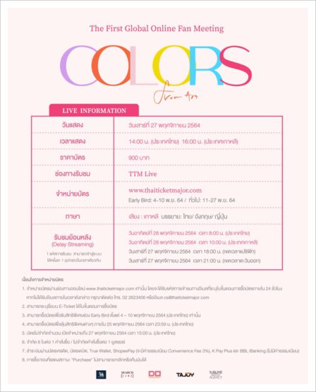 ยองแจ Got7 ประสบความสำเร็จในการปล่อยผลงานโซโล่ The 1st Mini Album ‘COLORS from Ars’ เมื่อเดือนตุลาคมที่ผ่านมา ได้รับกระแสตอบรับที่ดีเยี่ยมจากอากาเซ่ทั่วโลก และเพื่อเป็นการตอบแทนความรักจากแฟนๆ ที่มอบให้ ยองแจ Got7 จึงตั้งใจเตรียมการแสดงและกิจกรรมต่างๆ มากมายสำหรับงาน YOUNGJAE The First Global Online Fan Meeting ‘COLORS from Ars’ ที่จะเกิดขึ้นในวันเสาร์ที่ 27 พฤศจิกายนนี้ โดนแฟนคลับทั่วโลกสามารถเข้าชมงานแฟตติ้งครั้งนี้ผ่านระบบไลฟ์สตรีมมิง TTM Live โดยจะดำเนินงานเป็นภาษาเกาหลี และมีคำบรรยายภาษาไทย ภาษาอังกฤษ และภาษาญี่ปุ่น