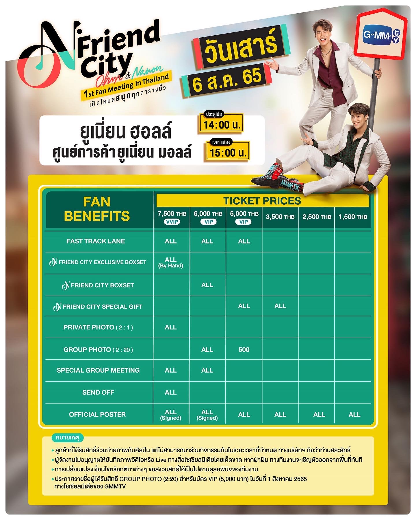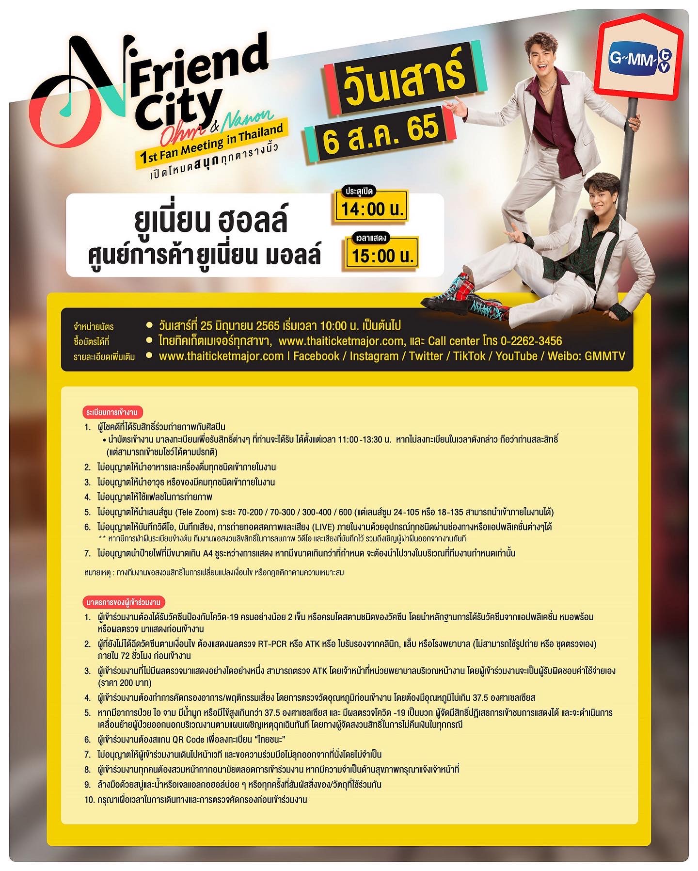 สำหรับผู้ที่สนใจสามารถจับจองบัตร เข้าร่วมเป็นส่วนหนึ่งในงานแฟนมีตติ้งครั้งแรกของ “โอม-นนน” กับงาน “O-N Friend City Ohm – Nanon 1st Fan Meeting In Thailand”