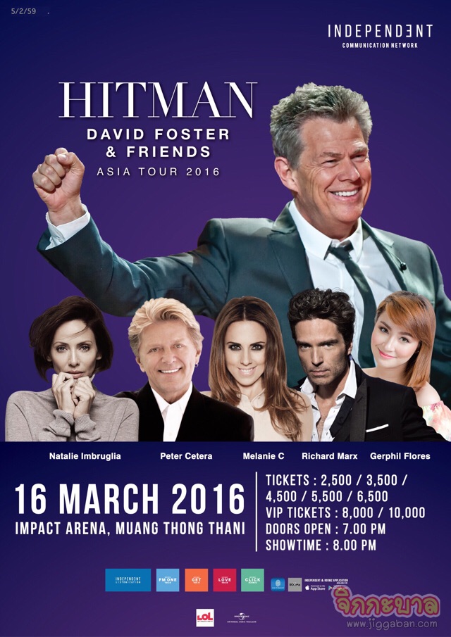 กลับมาอีกครั้งในรอบ 4 ปี ของคอนเสิร์ตสุดยิ่งใหญ่เต็มรูปแบบของศิลปินดังระดับตำนานสุดยอดปรมาจารย์ด้านการแต่งเพลง และโปรดิวเซอร์มือทอง ‘เดวิด ฟอสเตอร์’(David Foster)ที่งานนี้แท็กทีม 5 ศิลปินดังระดับโลก!! นาตาลี อิมบรูเลีย, ปีเตอร์ เซเทร่า, เมลานี ซี, ริชาร์ด มากซ์, เจอร์ฟิล ฟลอเรสมาร่วมปรากฏการณ์ทางดนตรีครั้งยิ่งใหญ่ให้สมการรอคอยของแฟนเพลงชาวไทยที่คุณไม่ควรพลาด!!! ใน ‘Independent Communication Network Presents Hitman David Foster & Friends Asia Tour 2016’ (อินดิเพ็นเดนท์ คอมมิวนิเคชั่น เน็ทเวอร์ค พรีเซ็นต์ ฮิตแมน เดวิด ฟอสเตอร์ แอนด์ เฟรนด์ เอเชีย ทัวร์ 2016)วันพุธที่ 16 มีนาคมนี้ เวลา 20.00 น. ณ อิมแพค อารีน่า เมืองทองธานี จองบัตรได้ตั้งแต่วันนี้ที่Thai Ticket Major ทุกสาขา บัตรราคา 10,000 / 8,000 / 6,500 / 5,500 / 4,500 / 3,500 และ 2,500 บาท และฟินสุด!!! กับโปรโมชั่นสุดคุ้มเอาใจสาวกฮิตแมน เพียงโชว์แอพพลิเคชั่น Independent ที่หน้าเคาน์เตอร์ลดทันที 10 % และพิเศษสุด!! สำหรับลูกค้าไทยพาณิชย์ จำกัด (มหาชน) ชำระผ่านบัตร SCB Private Banking, SCB First Privilege Banking รับส่วนลด 15% หรือชำระผ่านบัตรเครดิตประเภทอื่น ๆ ของธนาคาร รับส่วนลด 10% สำหรับลูกค้า Dtac rewardเพียงกด *140*493# และโทรออก รับส่วนลดทันที 10%ลูกค้า M Cardเพียงโชว์บัตรที่หน้าเคาน์เตอร์ลดทันที 10 %(1บัตรสมาชิก รับสิทธิ์สูงสุด 2 ที่นั่ง)!!! สอบถามรายละเอียดเพิ่มเติมโทร. 02-262-3456, www.thaiticketmajor.com ติดตามข่าวสารต่างๆเพิ่มเติมได้ที่คลื่น LOVE 104.5 หรือทางออนไลน์ www.independent.in.th, www.facebook.com/LOVE1045, application: Independent และระบบ LIVE ได้ที่ application: ROOMz, www.ROOMz.in.th หรือคลื่นวิทยุชั้นนำในเครือ ‘บริษัท อินดิเพ็นเดนท์ คอมมิวนิเคชั่น เน็ทเวอร์ค จำกัด’ FM ONE 103.5, GET 102.5, คลิ๊กมัน FM