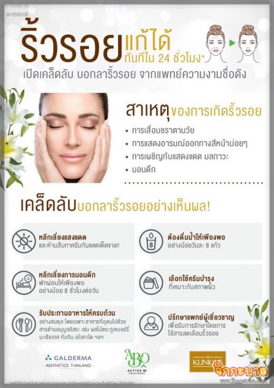 ริ้วรอยต่างๆ ก็จะหายไป ซึ่ง ก็ Botulinum Toxin Type A มีให้เลือกหลากหลายยี่ห้อ ขึ้นอยู่กับความต้องการของคนไข้ว่าต้องการแก้ปัญหาอะไรบ้าง หนึ่งในนั้นคือ ผลิตภัณฑ์ ABO Active 3D Treatment ซึ่งเป็นผลิตภัณฑ์ที่ให้ผลลัพธ์สวยเป็นธรรมชาติในการลดเลือนริ้วรอย ยกกระชับ ปรับรูปหน้า ช่วยในการกระตุ้นการตื่นตัวของเซลล์ที่สร้างคอลลาเจนหลังฉีดภายใน 10 ชั่วโมง ซึ่งมีงานวิจัยที่ยืนยันและรับรองข้อพิสูจน์นี้ และจะทำให้ผิวสวยอ่อนเยาว์ขึ้นทันที