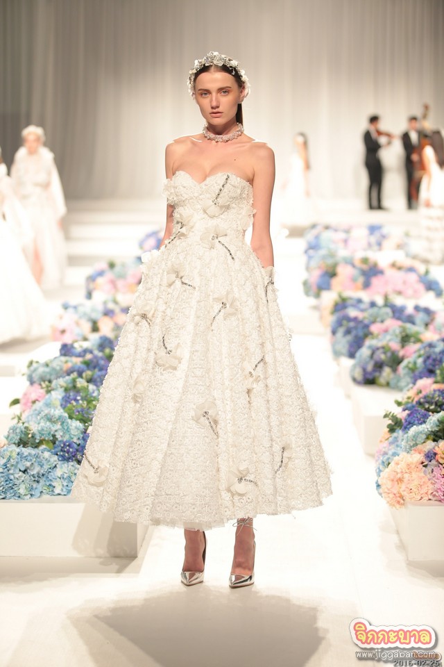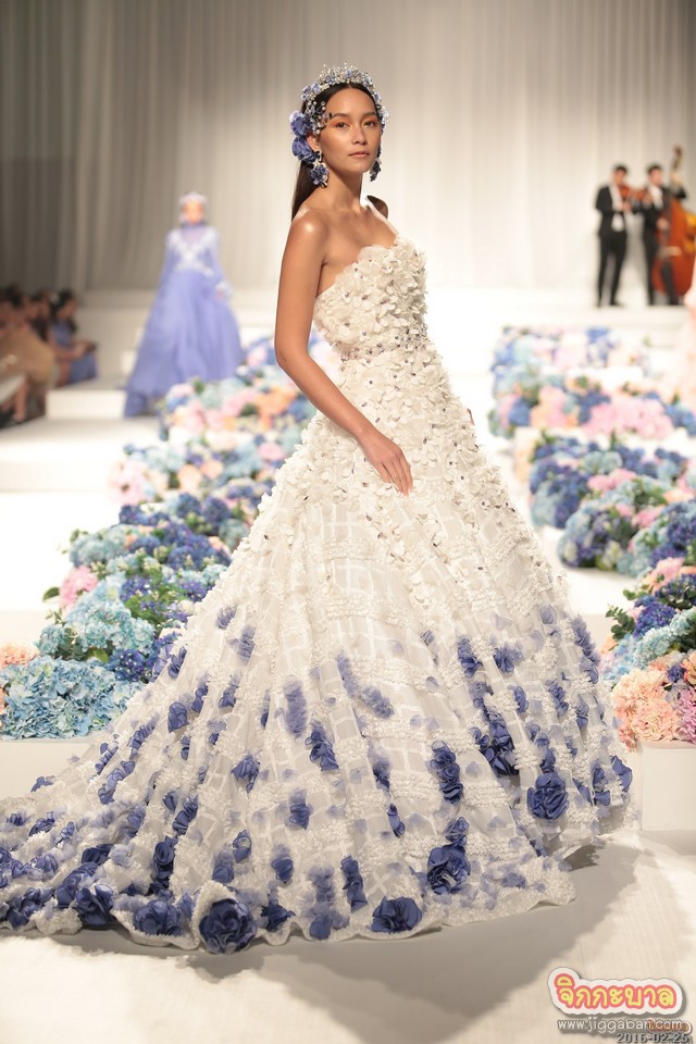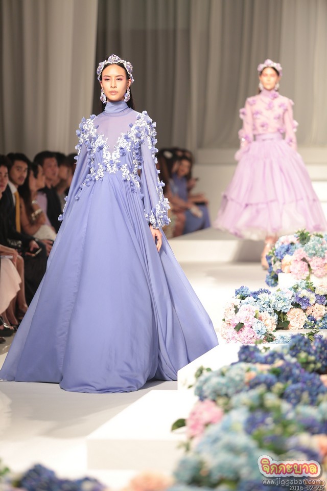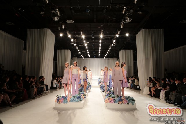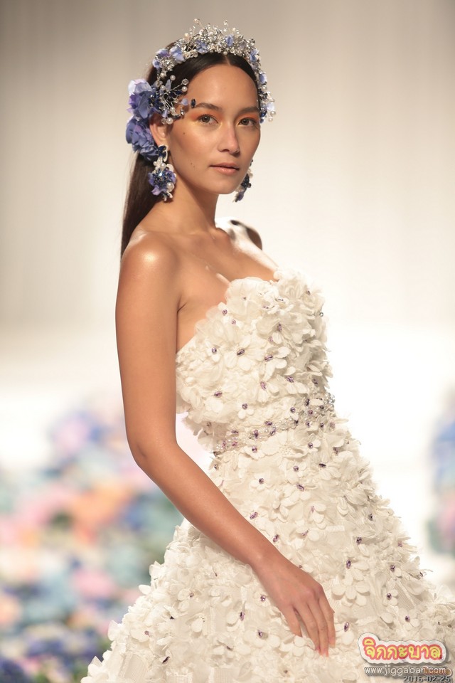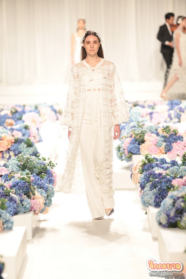 บรรยากาศในแฟชั่นโชว์ อบอวลไปด้วยความหวานของดอกไฮเดรนเยียร์ ที่แข่งกันบานสะพรั่งตั้งแต่ทางเข้า ยาวไปจนถึงรันเวย์ เสียงทรีโอแบนด์ บรรเลงเพลงเป็นสัญญาณเปิดฉากรันเวย์ ที่เริ่มต้นด้วยความตื่นตา เพลิดเพลินไปกับ 43 โททัลคีย์ลุค ที่ร้อยเรียงมาให้แฟชั่นนิสต้าได้ยลโฉมกันท่ามกลางทุ่งดอกไม้แห่งแสนหวาน โดยไฮไลต์ในคืนนี้ ยกให้ชุดฟินาเล่ สีขาวประดับปักเลื่อมเพิ่มความหรู เปล่งประกายออร่าระยิบระยับ จากงานคราฟท์ปักมือทั้งตัวความยาวกว่า 2 เมตร เรียกเสียงปรบมือส่งท้ายได้อย่างเกรียวกราว สุดประทับใจ