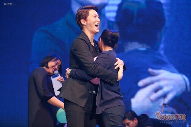 ภาพสลับมาที่พี่ตูน เอ๊ยไม่ใช่ จูวอน ในมาดร็อคเกอร์ที่เตรียมเพลงไทยมาเซอร์ไพรส์แฟนคลับกับเพลง “แสงสุดท้าย” ของ BODY SLAM บทเพลงที่พระเอกหนุ่มเลือกจะร้องเอง ฝึกร้องเอง ด้วยภาษาไทยที่ชัดเป๊ะ น้ำเสียงและลีลาที่ต่างลงความเห็นว่าคล้ายพี่ตูน ซะเหลือเกิน น่าเสียดายตรงที่พี่จ๋าไม่ยอมถอดเสื้อแบบพี่ตูนนี่ละ! แต่เพียงแค่นี้ก็ทำเอาเหล่าแฟนคลับทึ่งสุดปลึ้มในความตั้งใจของพี่จ๋า พากันส่งเสียงกรี๊ดกระจายสนั่นฮอลล์ทีเดียว กิจกรรมต่อมา “ลูกโป่งแตก” บอกได้คำเดียวว่านี่คือไฮไลท์ของงานสำหรับสาวๆ เพราะมีผู้โชคดี 7 ท่านได้ขึ้นมากอดกับพี่จ๋ายาวนานถึง 30 วินาที แต่มีข้อแม้ว่าต้องทำลูกโป่งแตกให้ได้มากที่สุด โดยรายแรกก็ทำแตกไปถึง 10 ลูก สร้างความหนักใจแก่ผู้เข้าแข่งขันท่านอื่นมาก จึงต้องเลือกระหว่าง “ทำลูกโป่งแตกให้ได้มากกว่า กับ ดึงเวลาไว้ให้ได้กอดพี่จ๋าให้นานที่สุด” ซึ่งดูเหมือนว่าส่วนใหญ่จะเน้นกอดแน่นๆแพ้ช่างมัน เว้นแต่ ป้าดา ขวัญใจมหาชนที่กอดก็แน๊นแน่น แถมทำแตกไปตั้ง 10 ลูก สุดท้ายต้องตัดสินผู้ชนะเลิศด้วยการเป่ายิ้งฉุบกับหนุ่มจูวอน ก่อนป้าดาจะชนะได้รับกิฟท์เซ็ตชุดใหญ่จากจูวอนไป หลังจบเกมพระเอกหนุ่มถึงกับต้องซับเหงื่อและบอกว่า “เหนื่อยนิดนึงแต่สนุกมากกกกครับ” แหมจะไม่เหนื่อยได้ไงเพราะต้องออกแรกกดฝ่ายเดียว ในขณะที่คนกอดก็เน้นกอดแบบเลือกชัดเจนจ้า ฟินเว่อร์กันไปส่วนคนดูก็ตาร้อนผ่าวกันไปสิคะ