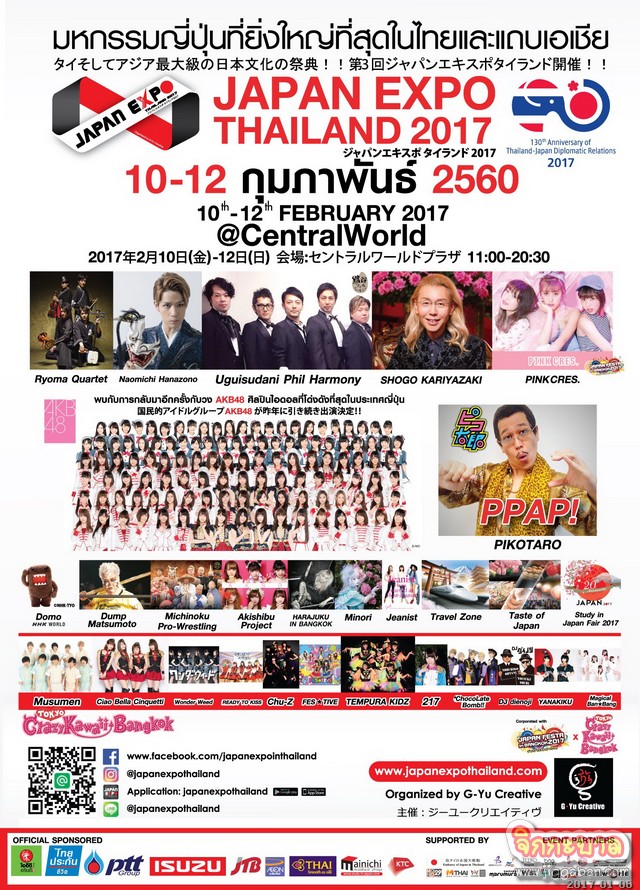 เตรียมนับถอยหลังสู่งานญี่ปุ่นที่ใหญ่ระดับเอเชีย สำหรับงาน Japan Expo Thailand 2017 ครั้งที่3 ที่สุดของความเป็นญี่ปุ่นตัวจริง!!! ที่กำลังจะเกิดขึ้นระหว่างวันศุกร์ที่ 10 ถึง วันอาทิตย์ที่12 กุมภาพันธ์ 2560 ที่จะถึงนี้ โดยบริษัท จี-ยู ครีเอทีฟ จำกัด ขนความเป็นสุดยอดของญี่ปุ่นมารวมตัวกว่า 11 โซน ณ ศูนย์การค้าเซ็นทรัลเวิลด์ ทั้งช้อป ชิม และชมความเป็นสุดยอดของญี่ปุ่นที่ถูกรวบรวมไว้อย่างยิ่งใหญ่ที่สุด ดีที่สุด และใหญ่ที่สุดในเอเชีย!!!