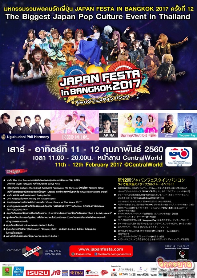 JAPAN FESTA IN BANGKOK 2017 ครั้งที่ 12 ปีนี้จะอัดแน่นไปด้วยศิลปินไอดอลญี่ปุ่น พร้อมสาวกคอสเพลย์-โคเวอร์แดนซ์ เสียงกรี้ดสนั่นไปกับกิจกรรมที่อัดแน่นเพื่อสาวกที่ชื่นชอบความเป็นญี่ปุ่นอย่างที่สุด เริ่มต้นด้วย Mini Live! Concert ของศิลปินไอดอลสาวสุดฮ๊อตจากญี่ปุ่น วง PINK CRES. นำทีมโดย Miyabi Natsuyaki หนึ่งในสมาชิกวง Berryz Kobo ที่จะมาสร้างความสนุกและความน่ารักที่จะทำให้บรรดาแฟนคลับฟินไปตามๆ กัน!!! พร้อมกับการ Exclusive Meet&Greet แบบใกล้ชิดกับศิลปินวง Uguisudani Phil Harmony นำทีมโดย Yoshimi Tokui (หนึ่งในสมาชิกของนักแสดงตลกญี่ปุ่นวง Tutorial) และนักแสดงหนุ่มรูปหล่อ Shuji Kashiwabara บนเวที นอกจากนี้สาวสวยเสียงดี AKIRA ผู้ขับร้องเพลง Anime และไอดอลสาวจาก Spring Chu♡bit และ Live! Anisong กับเพลง Anisong จาก Takaaki Konno