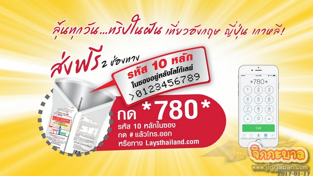 กติกาการร่วมสนุก ง่ายๆ เพียงแค่ซื้อผลิตภัณฑ์ เลย์รสใดก็ได้เฉพาะซองที่มีคำว่า ‘เปิดเลย์ เปิดโลก’แล้วส่งรหัสโดยกด *780*ตามด้วยรหัส 10 หลักในซองหลังโลโก้เลย์ กด # แล้วโทรออก (ส่งฟรีไม่มีค่าใช้จ่าย) หรือส่งรหัสผ่านทางเว็บไซต์ www.laysthailand.comสามารถส่งได้ตั้งแต่วันนี้ จนถึงวันที่10 มีนาคม 2560 ประกาศผลทุกวันเริ่ม 6 มกราคม 2560 ผ่านทาง www.laysthailand.comสอบถามรายละเอียดและเงื่อนไขเพิ่มเติม ได้ทางเว็บไซต์ www.laysthailand.com หรือ Call Center โทร. 0-2589-8900 และสามารถติดตามข่าวสารของ “เลย์” ได้ทาง Facebook LaysThailand, Instagram: LaysThailandหรือ LINE Official Account: