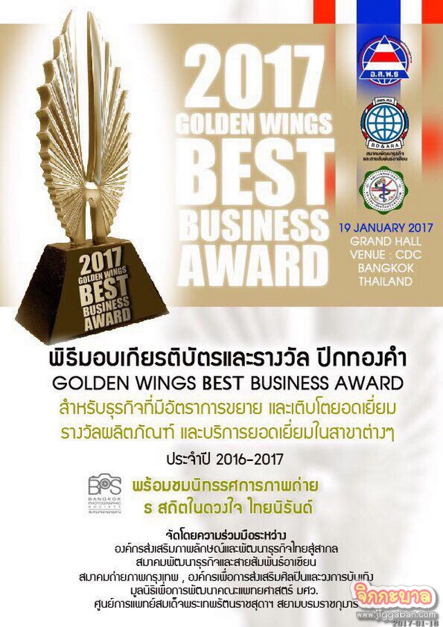 พิธีมอบเกียรติบัตรและรางวัล ปีกทองคำ (Golden Wings best business award) สำหรับธุรกิจที่มีอัตราการขยายและเติบโตยอดเยี่ยม รางวัลผลิตภัณฑ์และบริการยอดเยี่ยมในสาขาต่างๆประจำปี 2016-2017
