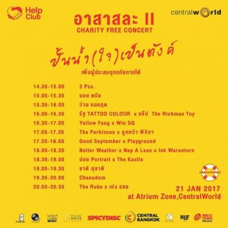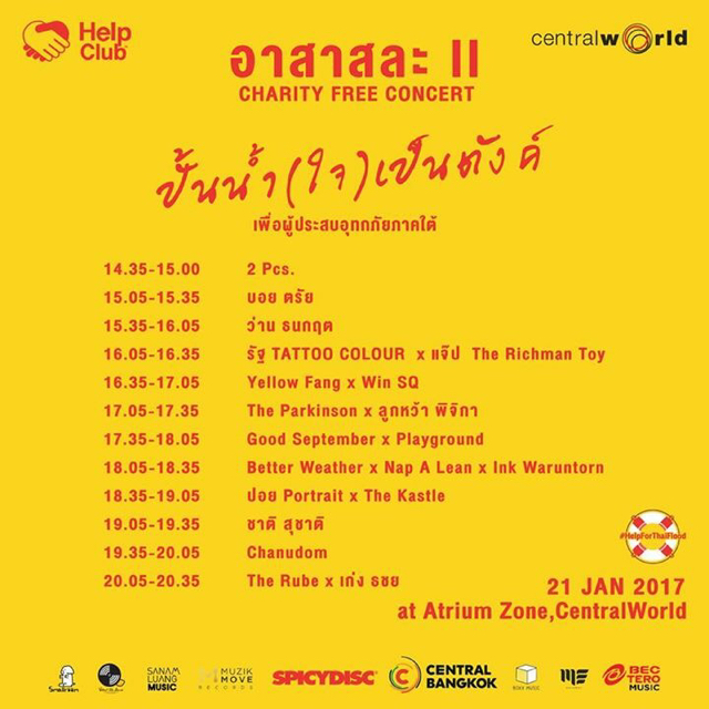 คอนเสิร์ตการกุศล “อาสาสละ II” ปั้นน้ำ (ใจ) เป็นตังค์ จาก โครงการ เฮล์ป คลับ (Help Club) เกิดขึ้นอีกครั้งเพื่อช่วยเหลือ ผู้ประสบอุทกภัยทางภาคใต้ โดยได้รับความร่วมมือจาก ศูนย์การค้าเซ็นทรัลเวิลด์ และศิลปินจากหลากหลายค่ายเพลง ไม่ว่าจะเป็น บอย ตรัย, ว่าน ธนกฤต, วิน ศิริวงศ์ (สควีซแอนนิมอล), เยลโล่ แฟง, ชาติ สุชาติ,เดอะ พาร์คินสัน, พิจิกา, เดอะ รู๊บ, เก่ง ธชย, แนป อะ ลีน, เบทเทอร์ เวทเทอร์, อิงค์ วรันธร, กู๊ด เซ็ปเทมเบอร์, รัฐ แทททู คัลเลอร์, แจ๊บ เดอะ ริช แมนทอย, เพลย์กราวด์, ปอย พอร์ตเทรต, เดอะ คาสเซิล, ทู พีซ, ชนุดม เป็นต้น ในวันเสาร์ ที่ 21 มกราคม 2560 เวลา 14.00 น. ณ ศูนย์การค้า เซ็นทรัลเวิลด์ โซน เอเทรียม (Atrium)