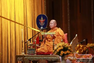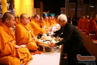 บรรยากาศในช่วงเช้า เริ่มด้วยพิธีการสงฆ์ แขกในงานพร้อมใจกันถวายเครื่องปัจจัยไทยธรรม แด่พระภิกษุสงฆ์ จำนวน ๘๙ รูป โดยมี ศาสตราจารย์ ดร.พระพรหมบัณฑิต (ประยูร ธมฺมจิตฺโต) เจ้าอาวาสวัดประยุรวงศาวาสวรวิหาร เป็นประธานฝ่ายสงฆ์ ต่อด้วยกิจกรรมถวายสักการะพระบรมฉายาลักษณ์ ในหลวงรัชกาลที่ ๙ และร่วมกันแสดงปณิธาน ‘ก้าวเดินตามรอยพระบาท’ ตามลำดับ
