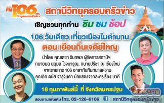 วิทยุครอบครัวข่าว ขอชวนแฟนๆร่วมกิจกรรม 106 วันเดียวเที่ยวเมืองในตำนาน ตอน เยือนถิ่นเจดีย์ใหญ่ จ.นครปฐม ในวันเสาร์ที่ 18 กุมภาพันธ์ หนึ่งวันเต็มที่คุณจะได้เที่ยวชิม ชม ช้อป ครบรสไปกับสถานที่แห่งความประทับใจมากมายของชาวนครปฐม นำโดย ผู้ประกาศและดารานักแสดงจากช่อง3 อาทิ คุณเดชา รินทพล ผู้จัดการสถานีวิทยุครอบครัวข่าว, ทนายมล นฤมล โรจนารุณ – ทนายปรีชา ณ เชียงใหม่ ผู้ดำเนินรายการ 106 อาสากับทีมทนายความ,คุณกิก-ดนัย จารุจินดา จากละคร นาคี ฯลฯ