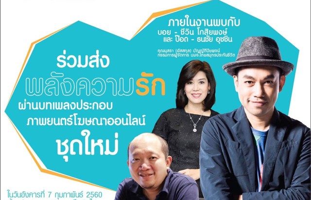 “งานแถลงข่าว“ Refresh Brand OCEAN LIFE ไทยสมุทรประกันชีวิต ” โดยคุณนุสรา อัสสกุล บัญญัติปิยพจน์ กรรมการผู้จัดการ บริษัท ไทยสมุทรประกันชีวิต จำกัด (มหาชน) พร้อมเปิดตัวภาพยนตร์โฆษณา และเพลงประกอบ ซึ่งได้รับเกียรติจากนักแต่งเพลงชื่อดัง “บอย – ชีวิน โกสิยพงษ์” มาร่วมพูดคุยถึงเรื่องราวความรัก พร้อม “ป๊อด – ธนชัย อุชชิน” ที่มาร่วมส่งต่อความรักผ่านเสียงเพลง ในโชว์สุดพิเศษ วันอังคารที่ 7 กุมภาพันธ์ 2560 เวลา 14.00 – 20.00 น. ณ ณ Blue Ribbon Screen ชั้น 5 @ Siam Paragon