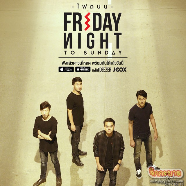 FridayNight To Sundayวง Pop Rock ที่แจ้งเกิดจากเพลง “ห้องนอน” ที่มียอดวิวในYoutubeมากถึง 243กว่าล้านวิว จากนั้นเส้นทางสายดนตรีพวกเค้าก็โตขึ้นเมื่อได้เข้าเซ็นสัญญาภายใต้สังกัดUniversal Music Thailandจนได้มีซิงเกิ้ลแรกซึ่งปล่อยไปเมื่อกลางปีที่แล้วกับเพลง “เอาที่เธอสบายใจ” และวันนี้พวกเค้า FridayNight To Sunday ก็ยังคงมุ่งมั่นสร้างสรรค์ผลงานเพื่อตอบแทนแฟนเพลงที่ติดตามกันมาไม่เคยหายไปไหน