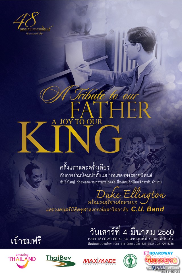 ศิลปินแจ๊สระดับตำนาน “Duke Ellington” พร้อมวงดุริยางค์ทหารบก และวงดนตรีนิสิตจุฬาลงกรณ์มหาวิทยาลัย C.U. Band พร้อมอุ่นเครื่องโชว์เพลงแจ๊ส!! ในงานแถลงข่าวกับมินิคอนเสิร์ตจาก วงดุริยางค์ทหารบก วันพฤหัสบดีที่ 23 กุมภาพันธ์ 2560 เวลา 14.00 น. ณ The Stage at Asiatique the Riverfront