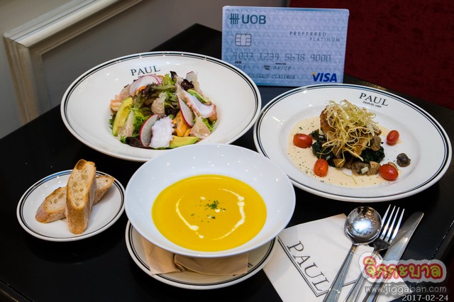 คุณจิรัฐติกาล ศิริพูนทรัพย์ ผู้อำนวยการฝ่ายธุรกิจบัตรเครดิต ธนาคารยูโอบีเปิดเผยว่า ผู้ที่ใช้จ่ายผ่านบัตรเครดิตยูโอบี ส่วนใหญ่จะเป็นในหมวดร้านอาหารเป็นหลัก ทางบัตรเครดิตยูโอบีจึงอยากมัดใจนักชิมโดยเฉพาะ ด้วยการมอบส่วนลดและสิทธิประโยชน์ที่ครอบคลุมร้านอาหารให้มากยิ่งขึ้นกว่าในปีที่ผ่านมา ทางบัตรเครดิตยูโอบี ได้ร่วมกับร้าน PAUL ร้านอาหารและเบเกอรี่ชื่อดังสัญชาติฝรั่งเศส เปิดตัวเมนูยอดนิยมทั้ง 6 เมนู โดยมี UOB Dining Ambassador ชาคริต แย้มนาม เป็นตัวแทนในการบอกต่อความอร่อย พร้อมพาชิมเมนูยอดฮิตในร้านอาหาร เริ่มต้นจากเมนูSoupe de jour (ซุป-เดอ-จู)ซุปประจำวันของทางร้านซึ่งในวันนี้เป็นซุปฟักทองความนุ่มละมุนลงตัวของฟักทองและครีมนั้นเข้ากันได้ดีจนเป็นเมนูยอดนิยมของทางร้าน ต่อด้วยSalade de la mer(ซาลาด-เดอ-ลา-แมร์)สลัดผัดออแกนิคนำเข้าเสิร์ฟพร้อมกับกุ้งย่าง หอยแมลงภู่ และปลาหมึกยักษ์ ราดด้วยน้ำสลัดสูตรเฉพาะของทางร้านตามด้วยเมนูจานหลักอย่างLoup à la poêle(ลูป-อะ-ลา-ปัวเลอ)ปลากระพงทะเลย่างสุกกำลังดี เสิร์ฟมาพร้อมกับผัดโขมและเห็ดผัด ราดซอสครีมเลมอน และโรยหน้าด้วยต้นหอมทอด