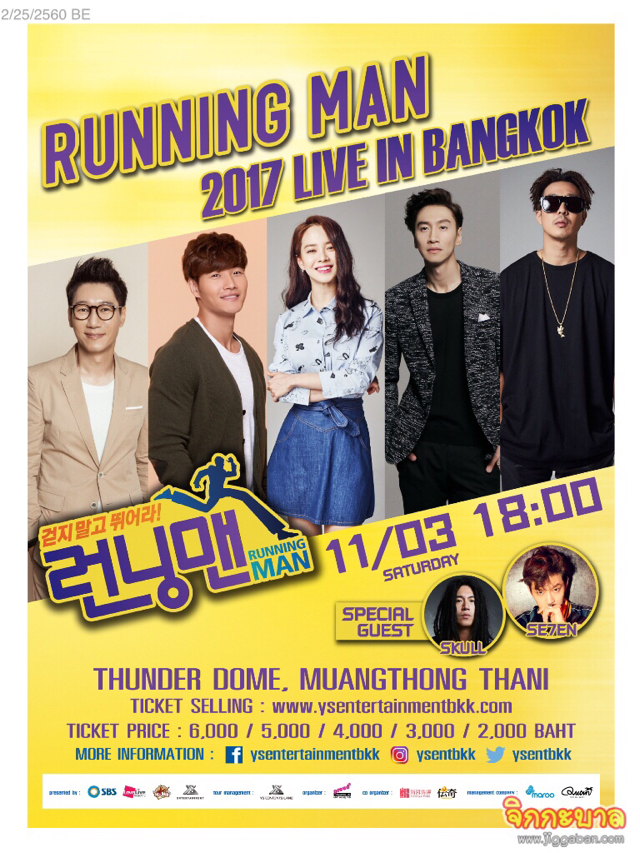 จัดเต็มกันมาอีกระลอก รันเนอร์ไทยที่ยังไม่ได้พุ่งตัวก็อย่ารอช้า เพราะนอกจากจะมีพิธีกรสุดฮาสมาชิกทั้ง 5 กลับมาเยือนอีกครั้ง ในครั้งนี้ยังเสริมทัพให้ปึ้กยิ่งขึ้นกับ Special Guest เจ้าชายหมายเลข 7 “SE7EN” (CHOI DONG WOOK) Dancing King เจ้าของบทเพลงสุดฮิต “Come Back to Me” และ SKULL คู่หูเร็ก HAHA ให้เวทีร้อนแรงยิ่งขึ้นไปอีก มาเตรียมพบกับความสนุกสนานและฮาสุดเหวี่ยง ในงาน RUNNING MAN 2017 LIVE IN THAILAND (รันนิ่ง แมน 2017 ไลฟ์ อิน ไทยแลนด์) ในวันเสาร์ที่ 11 มีนาคม นี้ ณ ธันเดอร์โดม เมืองทองธานี ตั้งแต่เวลา 18.00น.เป็นต้นไป บัตรราคา 6,000 / 5,000 / 4,000 / 3,000 และ 2,000 บาท ใครที่ยังไม่มีบัตรก็สามารถเข้าไปจับจองกันได้ที่หน้าเว็บหลัก www.ysentertainmentbkk.com ติดตามรายละเอียดเพิ่มเติมและสิทธิพิเศษต่างๆ พร้อมเช็คข้อมูลอัพเดทได้ทาง facebook : ysentertainmentbkk , Instagram: ysentbkk , twitter : ysentbkk อ้าว!!ประกาศกันอีกครั้งรันเนอร์ไทยทั้งหลายถึงเวลานัดรวมตัวหัวหน้าทีมของพวกเรามากันแล้ว