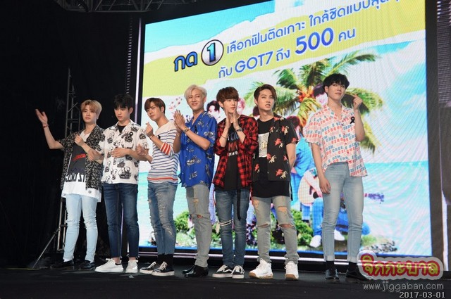 เรียกเสียงกรี๊ดห้างแทบแตกอีกครั้ง เพราะ 7 หนุ่มสุดฮอต GOT7 คัมแบคประเทศไทยคราวนี้ บอกเลยว่าจัดเต็มฟินกว่าที่ผ่านมาแน่นอน งานนี้เหล่า “อากาเซ” ไม่พลาดที่จะมาจับจองพื้นที่กันอย่างเนืองแน่น จนทำเอาลานพาร์คพารากอนที่อลังการดูเล็กไปแบบเห็นๆ หลังจากพิธีกรหนุ่มแอนดี้กล่าวต้อนรับ พร้อมเชิญนางเจษฎากร โคชส์ รองกรรมการผู้อำนวยการ บริษัท ไทยดริ้งค์ จำกัด กล่าวเปิดงานอย่างเป็นทางการ หลังจากนั้นก็เป็นช่วงเวลาสุดฟิน ของเหล่าแฟนคลับ เพราะทั้งเจ็ดหนุ่มเปิดตัวออกมาด้วยลุคใหม่สดใสรับซัมเมอร์แบบที่ไม่เคยเห็นที่ไหนมาก่อน นำโดย “แบมแบม” สมาชิกคนไทยในวง พร้อมด้วย “มาร์ค” “เจบี” “จินยอง” “แจ็คสัน” “ยองแจ” และ “ยูคยอม” ที่ขนเอาความซ่าซี้ดมาเต็มพิกัด