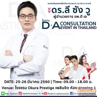 โรงพยาบาลศัลยกรรม ดี เอ (DA Plastic Surgery) โรงพยาบาลศัลยกรรมอันดับต้นๆของเกาหลี ที่มีคุณหมอ ลี ซัง วู ศัลยแพทย์ชื่อดังผู้เชียวชาญด้านโครงหน้า และสร้างความฮือฮาให้กับวงการศัลยกรรมเกาหลีมาแล้วมากมาย จากรายการ Let me in เกาหลี นำทีมผู้เชี่ยวชาญการทำศัลยกรรม และนายแบบนางแบบผู้ผ่านการศัลยกรรมจาก โรงพยาบาลศัลยกรรม ดี เอ บินตรงมาประเทศไทย จัดงาน “DA Consultation Event in Thailand” เปิดโอกาสให้ผู้ ที่สนใจทำศัลยกรรม เข้ารับการปรึกษาด้วยตนเองเกี่ยวกับการทำศัลยกรรมของแต่ละบุคคลแบบเฉพาะตัวกับคุณหมอ ลี ซัง วูพร้อมแจ้งราคาประเมินเบื้องต้น เพื่อให้ผู้สนใจสามารถเตรียมความพร้อมในทุกๆ ด้าน ก่อนเดินทางไปทำศัลยกรรมจริง ที่โรงพยาบาลศัลยกรรม ดี เอ ณ กรุงโซล ประเทศเกาหลีใต้ในวันเสาร์ และอาทิตย์ ที่ 25-26 มีนาคมนี้ ตั้งแต่เวลา 09.00 – 18.00 น. ณ โรงแรม Okura Prestige เพลินจิต ห้อง Drawing 1 โดยมีค่าใช้จ่ายในการเข้าร่วมงาน 1,000 บาท ต่อท่าน รายได้ทั้งหมดจะนำไปมอบให้เป็นการกุศลต่อไป และพิเศษ!! สำหรับผู้ที่ตกลงจองคิวศัลยกรรมกับโรงพยาบาลศัลยกรรม ดี เอ ภายในงาน จะได้รับส่วนลดทันที 10 – 30% จองคิวเข้าร่วมงาน และสอบถามรายละเอียดเพิ่มเติมได้ที่ โทร.086-387-3518