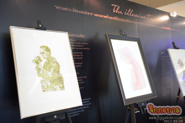 ด้านผลงาน The Illumination แต่ละชิ้น มีคอนเซปต์อันทรงพลัง ประกอบด้วย ทรงทำ วาดจากสีของดิน แรงบันดาลใจจากโครงการชั่วหัวมัน พระราชกรณียกิจ ที่ต้องการทำให้ดูเป็นตัวอย่าง อะไรที่ทำไม่ได้ ทรงแก้ปัญหาคำว่าดินไม่ดี ด้วยการเจาะจงซื้อที่ดิน แห้งแล้ง ติดปัญหาเรื่องน้ำ แล้วเพาะปลูก เพื่อที่จะทรงทำให้เห็นว่า ทำได้ , ร่มเงาแห่งความเพียร ทำจากสีของพันธุ์ไม้ที่ทรงปลูกในสถานที่ต่างๆ, แข็งแรงจากข้างใน วาดจากนมจิตรลดา ตัวอย่างการเริ่มต้น ทำงานโดยที่หวังสิ่งใด แต่กาลเวลากลับให้ผลตอบแทนเกินคุ้มค่า, ขุนเขา วาดจากสีของเมล็ดกาแฟ ทรงไม่ลดละต่อการแก้ปัญหาปลูกฝิ่น แม้จะพบว่าเมล็ดกาแฟที่มอบให้ปลูกทดแทน เหลือรอดเพียงต้นเดียวบนยอดเขาที่ห่างไกล ก็เสด็จไป, ปัญหายากแก้ง่าย วาดจากหญ้าแฝก ที่ช่วยแก้สารพัดปัญหา น้ำท่วม ดินถล่ม รักษาหน้าดิน, รสชาติของความสุข วาดด้วยผลไม้เมืองหนาวต่างๆ จากโครงการหลวง ช่วยชาวเขาเลิกปลูกฝิ่น, เส้นทางเกลือ วาดด้วยเกลือ ว่าด้วยพระอัจฉริยภาพการพลิกวิธีคิด ผสมไอโอดินลงในเกลือ ช่วยชาวอีสาน, สัมผัส วาดด้วยสีของผลส้ม พระเมตตาอย่างหาที่สุดมิได้ ที่มีต่อผู้ป่วยโรคเรื้อน, ภาพเพียร ทำจากต้นข้าว ฟางข้าว เมล็ดข้าว แนวคิดจากพระราชดำรัส ว่าข้าวต้องปลูก อีกยี่สิบปี ประชากรแปดสิบล้านคน จะได้ไม่อดอยาก อย่างน้อยก็มีข้าวกิน, ค่าของแกลบ วาดจากแกลบเผา เปลือกข้าวไร้ค่า นำมาเป็นพลังงานทดแทน ตัวอย่างการใช้ทรัพยากรอย่างคุ้มค่าของพระองค์ฯ และ พลังที่มองไม่เห็น วาดจากควันที่เกิดจากน้ำมันแก๊สโซฮอล์ ประชาชนทั่วไป สามารถชื่นชมในพระอัจฉริยภาพ และแนวคิดของพระองค์ท่าน ซึ่งเป็นแรงบันดาลใจในผลงานสร้างสรรค์ได้ระหว่างวันที่ 16 มีนาคม – 16 พฤษภาคม นี้ สามารถเข้าชมฟรีณลานกิจกรรม อาคารสินธร ทาวเวอร์ ถนนวิทยุ