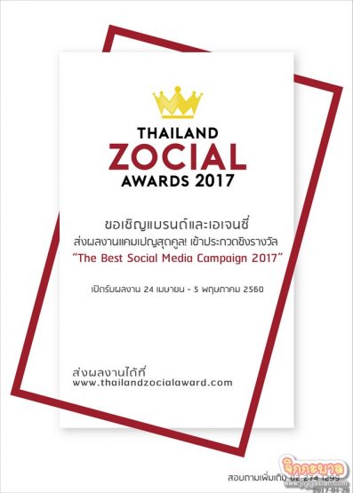 ทั้งนี้ สามารถดูรายละเอียดเพิ่มเติม และส่งผลงานเข้าประกวดได้ ตั้งแต่ 24 เมษายน – 5 พฤษภาคม 2560 ทาง www.thailandzocialawards.com ติดต่อสอบถามได้ที่ 06 3941 9555, 06 2454 9787