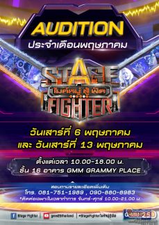 รายการ “Stage Fighter ไมค์หมู่ สู้ ฟัด”เปิดรับสมัคร Audition ผู้ที่สนใจจะต้องสมัครมาเป็นทีมไม่จำกัดเพศ ไม่จำกัดวัยทีมละ 3 คน เพื่อดวลเพลงกันแบบตัวต่อตัว ใครที่แพ้จะถูกคัดออก ส่วนคนที่ชนะได้อยู่ต่อ เพื่อแข่งขันจนกว่าชนะทีมคู่ต่อสู้ ทีมใดคนหมดก่อนแพ้ ทีมชนะจะเป็นแชมป์ประจำสัปดาห์ รอการท้าชิงจากทีมต่อไป ด้วยจำนวนคนที่เหลืออยู่เปิดรับสมัคร Audition ในวันที่ 6 พฤษภาคม2017และวันที่ 13 พฤษภาคม2017เวลา 10.00 น. – 18.00 น. ชั้น 16 อาคาร GMM Grammy Placeสำหรับผู้ที่สนใจสามารถสอบถามรายละเอียดได้ที่โทร 08-1751-1989หรือ 09-0880-8983 และ FB : stagefighter