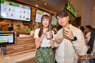 สดชื่นกันตั้งแต่งานยังไม่เริ่ม เมื่อคนรักสุขภาพและชื่นชอบการทานน้ำผักผลไม้ ต่างมารอต่อคิวกันตั้งแต่ 5 ทุ่มก่อนวันเปิดร้าน โดยมีสองพระ-นางสุดฮอต “นาย-แพท” ที่แท็กทีมมาร่วมแสดงความยินดีในงานฉลองเปิดตัว แจมบาร์ จูซ (Jamba Juice) แบรนด์เครื่องดื่มสมูทตี้น้ำผักและผลไม้สดจากธรรมชาติ อันดับ 1 จากอเมริกา ซึ่งนอกจากจะเป็นเครื่องดื่มน้ำผักและผลไม้ที่หวานธรรมชาติ ปราศจากสารเคมีปรุงแต่งแล้ว เมื่อนำมาจับคู่กันแล้วจะกลายเป็นเมนูเครื่องดื่มที่มีรสชาติอร่อยหอมหวาน และสามารถเพิ่มคุณประโยชน์ด้วยการเติมบูสท์ (Boosts) ที่มีให้เลือกหลากหลายถึง 3 ประเภทเมนู ได้แก่ สมูทตี้ (Smoothie) และ สมูทตี้ เพิ่ม บูสท์, น้ำผลไม้คั้นสด (Juice) และ เอนเนอร์จี้ โบลว์ (Energy Bowl) ซึ่งตัวเอนเนอร์จี้ โบลว์ นับว่ากำลังเป็นที่นิยมมากในเมืองนอก เพราะเป็นอาหารแคลอรี่ต่ำ แต่ให้พลังงานสูง เหมาะกับคนทำงานที่เร่งรีบและไม่ค่อยมีเวลา