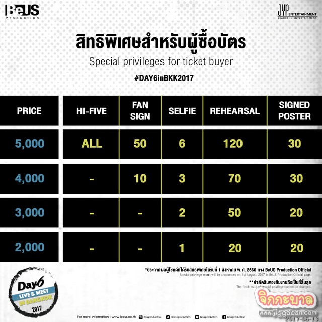DAY6 เปิดตัวอย่างเป็นทางการเมื่อต้นเดือนกันยายน ปี 2015 ด้วยคอนเซ็ปต์วงดนตรีร็อคที่พร้อมจะมอบผลงานคุณภาพซึ่งแตกต่างจากการเป็นบอยแบนด์ พวกเขาแจ้งเกิดด้วย Congratulations ซิงเกิ้ลหลักจากอีพีอัลบั้มชุดแรก The Day ท่ามกลางการตอบรับจากแฟนๆ อย่างล้นหลาม และร้อนแรงทำให้ DAY6 ได้รับการยอมรับจนได้รับการเสนอชื่อชิงรางวัลสาขา ‘ศิลปินหน้าใหม่ยอดเยี่ยม’ จากหลากหลายสถาบัน มาในเดือนมีนาคม ปี 2016 DAY6 ก็เสิร์ฟอีพีอัลบั้มชุดที่สอง DAY DREAM ออกมา และส่งเพลงแสนเศร้า Letting Go กลายเป็นเพลงฮิตติดหู มาในปี 2017 นี้ พวกเขาทั้งห้าก็จุดประกายสีสันใหม่ๆ ให้แก่วงการเพลงอีกครั้ง ด้วยการประกาศเปิดตัวโปรเจค Every DAY6 Project แผนงานระยะยาวที่หนุ่มๆ DAY6 จะปล่อยซิงเกิ้ลใหม่ทุกวันที่ 6 ของเดือน รวมทั้งจัดไลฟ์และคอนเสิร์ตเป็นประจำทุกเดือน เรียกว่าจัดเต็มให้แฟนๆ ได้เต็มอิ่มกันตลอดทั้งปี 2017 และโปรเจคยาวนี้ก็มีประเทศไทยร่วมอยู่ด้วย ให้เหล่ามายเดย์ ไทย หัวใจเต้นรัวๆกันอีกครั้ง เมื่อ BeUS Production ประกาศข่าวดีนำหนุ่มๆทั้ง 5 ลัดฟ้ากลับมาอีกครั้งกับงาน DAY6 LIVE & MEET IN BANGKOK 2017 (เดย์ซิก ไลฟ์ แอนด์ มีท อิน แบงคอก 2017) ในวันอาทิตย์ที่ 13 สิงหาคม 2560 ณ เมืองไทย จีเอ็มเอ็ม ไลฟ์เฮ้าส์ ชั้น 8 ศูนย์การค้าเซ็นทรัลเวิลด์ เวลาแสดง: 17:00 น. (ประตูเปิด 16.00น.) ราคาบัตร 5,000 / 4,000 / 3,000 / 2,000 บาท โดยเริ่มเปิดจำหน่ายบัตรวันเสาร์ที่ 1 กรกฏาคม 2560 ตั้งแต่เวลา 10:00 น. เป็นต้นไป ที่ ไทยทิคเก็ตเมเจอร์ ทุกสาขา หรือ www.thaiticketmajor.com โทร.02-262-3456… เหล่ามายเดย์ห้ามพลาดงานนี้มีโปรโมชั่นจัดเต็มมาให้เลือก…อยากดับเบิ้ลฟินระดับไหนและมีอะไรบ้าง สามารถติดตามรายละเอียดสิทธิพิเศษพร้อมข้อมูลอัพเดทได้ทางFacebook: BeUS Production / IG :@BeUSProduction / Twitter :@BeUSProduction