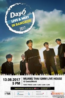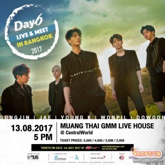ได้เวลานับหนึ่งให้ถึงหก! เพื่อพบกับมิวสิคแบนด์วงแรกและวงเดียวจากสังกัด JYP Entertainment (เจวายพี เอนเตอร์เทนเม้นท์) ‘DAY6’ (เดย์ซิก) วงที่กำลังกุมหัวใจของแฟนเพลงเกาหลีอยู่ในขณะนี้ โดย BeUS Production (บีอุส โปรดักชั่น) ผู้จัดโพรไฟล์น่าเชื่อถือ ผู้เคยสร้างความประทับใจกันมาแล้วจากงาน “DAY6 The 1st Live & Meet in Bangkok 2015” (เดย์ซิก เดอะ เฟิร์ส ไลฟ์ แอนด์ มีท อิน แบงคอก 2015) แฟนมีตติ้งครั้งแรกของพวกเขา ได้กลับมาจับมือกับ JYP Entertainment อีกครั้ง ประกาศข่าวดีให้เหล่า มายเดย์ (My Day : ชื่อเรียกกลุ่มแฟนคลับของDAY6) ที่รอคอยหนุ่มๆ ‘DAY6’ มานานนับปีเตรียมหัวใจกันให้พร้อม กับงาน DAY6 LIVE & MEET IN BANGKOK 2017 (เดย์ซิก ไลฟ์ แอนด์ มีท อิน แบงคอก 2017)