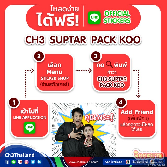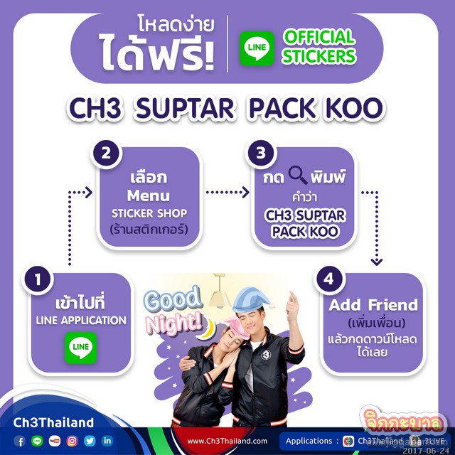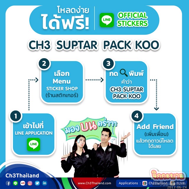อย่ารอช้า โหลดเลย!! เพียงกด Add Friend Line Ch3Thailand หรือ Search หาสติ๊กเกอร์ไลน์ CH3 SUPTAR PACK KOO สามารถดาวน์โหลดฟรีได้แล้วตั้งแต่วันนี้เป็นต้นไป