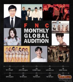 โอกาสดีๆมาถึงแล้ว สำหรับใครที่อยากไปโลดแล่นบนเส้นทางวงการบันเทิงที่ประเทศเกาหลี เมื่อ FNC Entertainment บริษัทต้นสังกัดของศิลปินดาราชื่อดังมากมาย อาทิ พิธีกรแห่งชาติ “ยูแจซอก” (Yoo Jae-suk), นักแสดงตลกขวัญใจแฟนๆ “อีกุกจู” (Lee Guk-Joo) รวมทั้งศิลปินนักร้องที่โด่งดังสุดอย่าง FTisland, CNBLUE, AOA, SF9, และอีกมากมาย ผุดโครงการ “FNC Global Audition 2017” เพื่อค้นหาศิลปินหน้าใหม่เข้าร่วมสังกัด และให้โอกาสเด็กรุ่นใหม่ที่ฝันอยากจะเป็น นักร้อง นักแสดง นายแบบ นางแบบ ได้สานฝันในวงการบันเทิงด้วยตัวเอง โดยก่อนหน้านี้ได้เปิดออดิชั่นไปแล้วในหลายประเทศ ได้แก่ จีน, ไต้หวัน, อเมริกา และประเทศล่าสุดที่เพิ่งประกาศออกมาก็คือประเทศไทยนั่นเอง