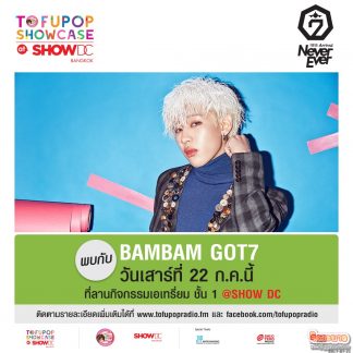 และพิเศษสุดๆ ในวันที่ 22 กรกฎาคมนี้ หนุ่ม “แบมแบม” สมาชิกวง GOT7 จะมาพบปะแฟนๆ ให้ได้กรี๊ดแบบใกล้ชิด ในงาน TofuPOP Showcase “GOT7” With BAMBAM พร้อมลุ้นได้ Fan Sign และ Hi Touch กับ “แบมแบม” เพียงแค่ Pre-Order อัลบั้ม FLIGHT LOG : ARRIVAL [THAILAND EDITION] ภายในงานเท่านี้ก็มีลุ้นเป็นผู้โชคดีที่จะได้ Fan Sign กับ “แบมแบม” จำนวน 20 ท่านและได้ Hi Touch กับ“แบมแบม” อีกจำนวน 20 ท่าน เตรียมมากรี๊ดให้กำลังใจ “แบมแบม” ได้ที่ โชว์ดีซี ณ ลานเอเทรี่ยม ชั้น 1 ในวันที่ 22 กรกฎาคมนี้ ได้ตั้งแต่เวลา 15.00-17.00 น. รายละเอียดเพิ่มเติมที่ www.tofupopradio.fm หรือ Facebook.com/TofuPOPRadio และสามารถติดตามสัมภาษณ์พิเศษกับ BAMBAM – GOT7 ในวันเสาร์ที่ 22 ก.ค. นี้ เวลา 15.15 น. ถ่ายทอดสดผ่านทาง Facebook Live @TofuPOPRadio