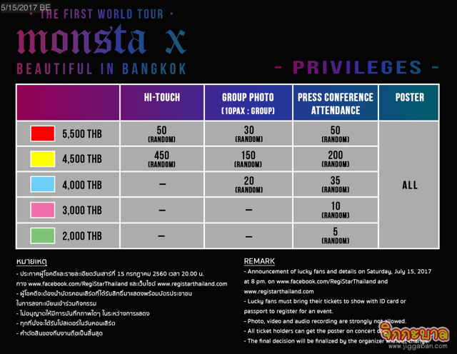 สำหรับใครที่ยังไม่มีบัตรในครอบครองอย่ามัวแต่ซุ่ม เพราะได้เวลาที่ทุกคนต้องลุกขึ้นมาทุ่มเป็นการด่วน นอกจากสิทธิพิเศษที่เพิ่มมาแล้ว หนุ่มๆ เขายังมีเตรียมความพิเศษไว้รออีกเพียบ จะเป็นอะไรนั้น ต้องมาสัมผัสด้วยตัวเองใน MONSTA X THE FIRST WORLD TOUR BEAUTIFUL IN BANGKOK … ยังจับจองบัตรกันได้ทาง www.registarthailand.com บัตรราคา 5,500 (ยืน) / 4,500 (ยืน) / 4,000 / 3,000 และ 2,000 บาท และติดตามอัพเดทความเคลื่อนไหวต่างๆ ได้ที่ Facebook fanpage : https://www.facebook.com/RegiStarThailand / Website : www.registarthailand.com