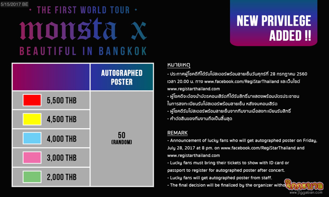 มอนเบเบ้ ที่มีบัตรในมือแล้ว กำไว้ให้แน่น เพราะนอกจากทั้ง 7 หนุ่มจะส่งคลิปมาอ้อนไปเมื่อครั้งก่อน พวกเขายังเทหมดหน้าตักจัดเซอร์ไพรส์ให้อีกหนึ่งชุด กับการเพิ่มสิทธิพิเศษ โปสเตอร์พร้อมลายเซ็นจำนวน 50 รางวัล โดยสุ่มผู้โชคดีจากการซื้อบัตรคอนเสิร์ตทุกราคา ตั้งแต่วันที่ 25 มิถุนายน – 26 กรกฏาคม 2560 โดยจะประกาศผลผ่านทางเว็บไซต์ www.registarthailand.com และ Facebook fanpage : https://www.facebook.com/RegiStarThailand วันศุกร์ที่ 28 กรกฎาคม 2560 เวลา 20.00 น.