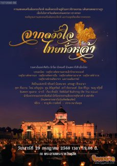 เนื่องในโอกาสเฉลิมพระชนมพรรษา สมเด็จพระเจ้าอยู่หัว 28 กรกฎาคม 2560 ขอเชิญชมคอนเสิร์ตแห่งปี “จากดวงใจ ไทยทั่วหล้า” ที่รวมพลังตัวโน้ตจิตอาสาของวงดุริยางค์ 4 เหล่าทัพ กรมศิลปากร และวงดนตรีเฉลิมราชย์ พร้อมด้วยศิลปินคับคั่ง 465 ชีวิต ร่วมส่งความสุขผ่านบทเพลงและการแสดงโชว์สุดพิเศษ ครั้งแรกและครั้งสำคัญในประวัติศาสตร์คอนเสิร์ตที่จะรวมวงดนตรี และศิลปินทุกหมู่เหล่า หลากหลายแนวเพลงไว้บนเวทีเดียวกัน เพิ่มดีกรีความสุขกับการการแสดงชุด เกียรติศักดิ์ทหารกล้า , แอ่วเหนือกับทัพฟ้า, ทะเลงามตาราชนาวี, สานศิลป์ดนตรี ณ สีชัง, เสียงแคนดังผู้พิทักษ์บรรเลง, เฉลิมราชย์ผูกสัมพันธ์เพลง รำวงสวยเด่นด้วยสามัคคี และชุดสุดท้าย จากดวงใจ ไทยทั่วหล้า ถวายพระพรด้วยจงรักและภักดี ร่วมขับขานบทเพลงอันไพเราะโดยศิลปินชื่อดัง อาทิ ศิลปินแห่งชาติ ชรินทร์ นันทนาคร เจ้าของบทเพลง เรือนแพ และ เศรษฐา ศิระฉายา บทเพลง ค่าของคน ร่วมด้วย ชมพู ฟรุตตี้, อรวี สัจจานนท์, ใหม่ เจริญปุระ, ก้อง ห้วยไร่, จินตรา พูนลาภ, บ่าววี, อ๊อด คีรีบูน, สุดา ชื่นบาน, ทูน หิรัญทรัพย์ และนักร้องจากวงดนตรีกรมประชาสัมพันธ์ 12 ชีวิต ที่จะมามอบความสุขแบบต้นตำรับในบทเพลง “รำวงมาตรฐาน” พร้อมการแสดงประกอบสุดอลังการ จากสถาบันบัณฑิตพัฒนศิลป