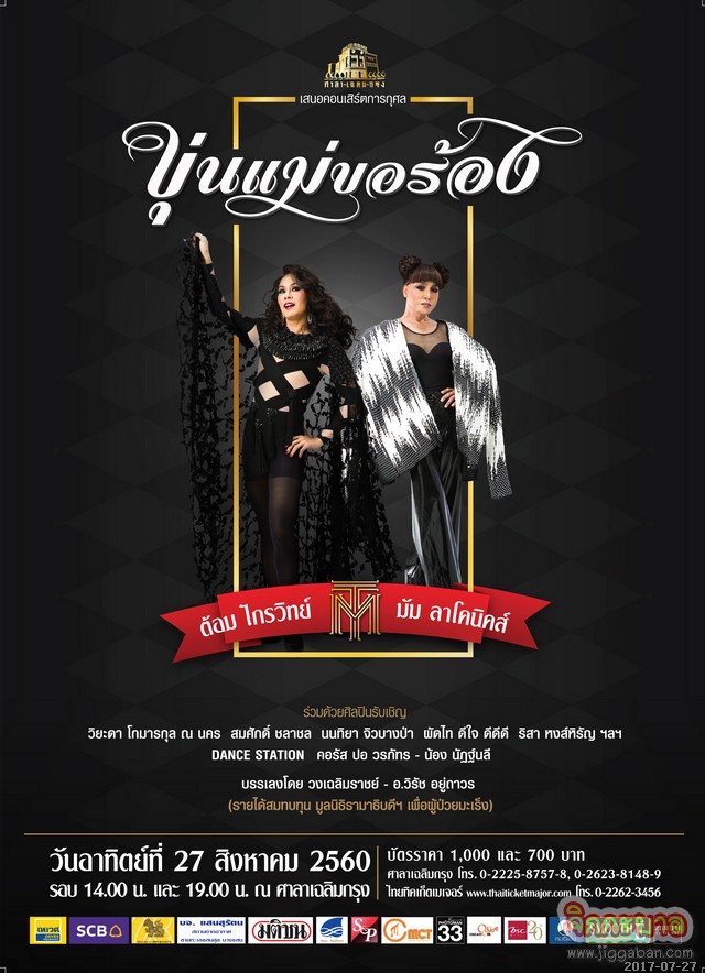 พลาดไม่ได้กับคอนเสิร์ต “ขุ่นแม่ขอร้อง” ต้อม ไกรวิทย์ พุ่มสุโข & มัม ลาโคนิคส์ วันอาทิตย์ที่ 27 สิงหาคม 2560 2 รอบการแสดง 14.00 น. และ 19.00 น. ณ ศาลาเฉลิมกรุง รายได้สมทบทุนมูลนิธิรามาธิบดีฯ เพื่อช่วยเหลือผู้ป่วยโรคมะเร็ง บัตรราคา 1,000 บาท และ 700 บาท จำหน่ายบัตรที่ศาลาเฉลิมกรุง โทร 0-2225-8757-8, 0-2623-8148-9 และไทยทิคเก็ตเมเจอร์ ทุกสาขา โทร.0-2262-3456 www.thaiticketmajor.com